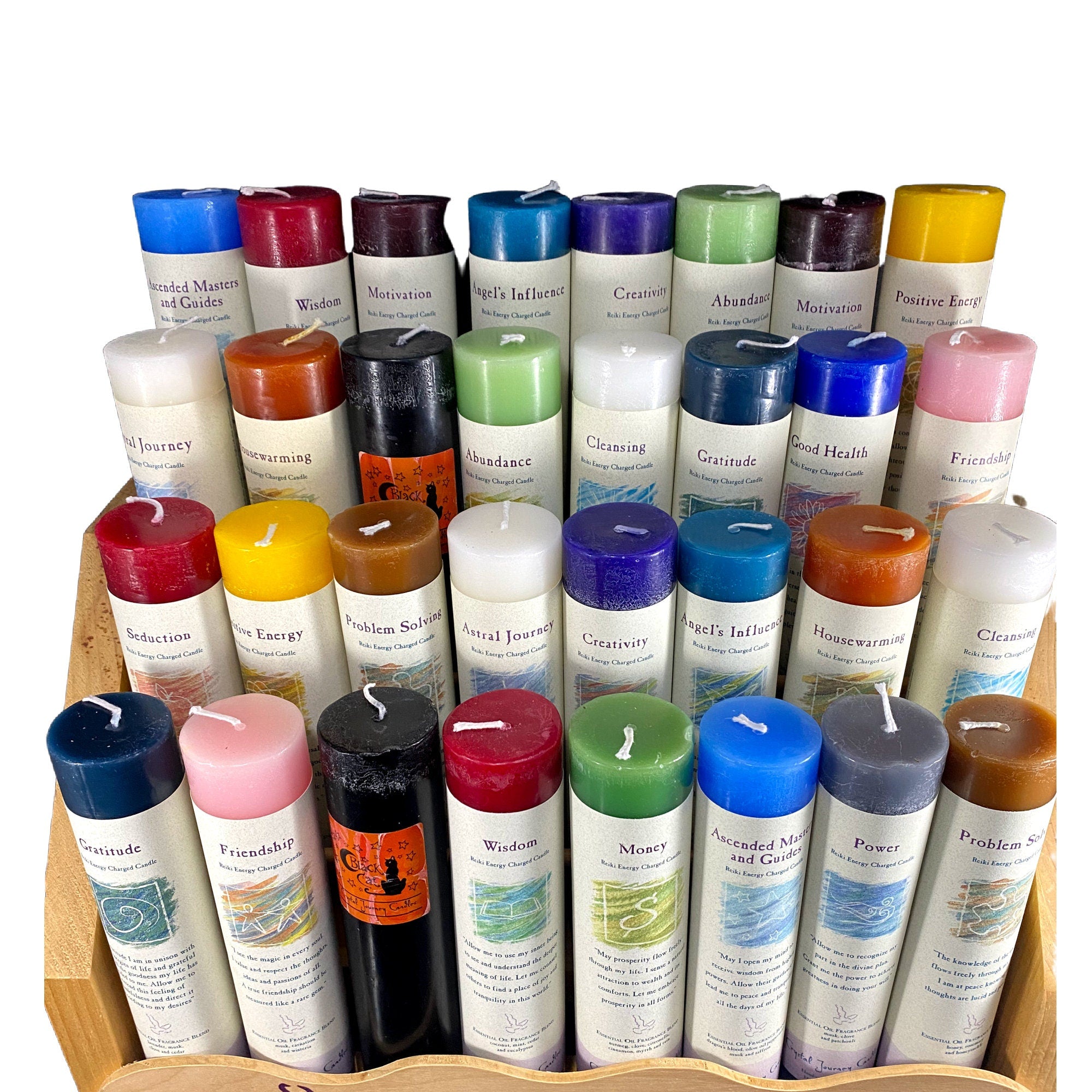 Abundance: Clove, Citronella, Lemon Balm, Cinnamon, Nutmeg Angel's Influence: Honeysuckle, Sweet Heather, Rose, Peppermint Ascended Master: Dragon's Blood, Olive Oil, Saffron, Peppermint, Musk Astral Journey: Rosemary, Frankincense, Myrrh, Citronella, Cypress Cleansing: White Sage, White Thyme, White Birch, Hyssop Compassion: Orange Blossom, Vanilla, Chamomile Confidence: Pine, Patchouli, Salt, Cypress Courage: Grapefruit, Pine, Rosemary Creativity: Iris, Rose, Cinnamon Dreams: Lavender, Rosemary, Ylang Ylang Friendship: Musk, Carnation, Wisteria Good Health: Clove, Nutmeg, Lemon Balm, Poppy Seed, Cedar, Honeysuckle, Juniper Gratitude: Lavender, musk, clove, and cedar Harmony: Orange Blossom, Rose, Sassafras, Juniper, Myrrh, Dragon's Blood Healing: Cedar, Ocean, Lemon Balm, Heather Housewarming: Cinnamon, Apple, Orange Joy: Plumeria, Jasmine, Sandalwood Laughter: Citrus Love: Olive Oil, Patchouli, Rose, Clove, Lavender, Dragon's Blood Manifest a Miracle: Magnolia, Honeysuckle, Rose Money: Clove, Cinnamon, Nutmeg, Myrrh, Citronella, Rain Mother: Orange blossom, chamomile, and vanilla Motivation: Sunflower, Myrrh, Frankincense Peace: Vanilla, Clove, Myrrh, Ginger Root, Caraway Seed Positive Energy: Frankincense, Dragon's Blood, Sandalwood, Saffron Power: Clove, Musk, Patchouli Problem Solving: Rosemary, Honey, Honeysuckle Protection: Frankincense, Sandalwood, Rosemary, Clove Seduction: Musk, Patchouli, Pine, Cedar, Juniper Spirit: Sage, Lemon, Clove Wisdom: Coconut, Mint, Cedar, Eucalyptus Black Cat: Clove