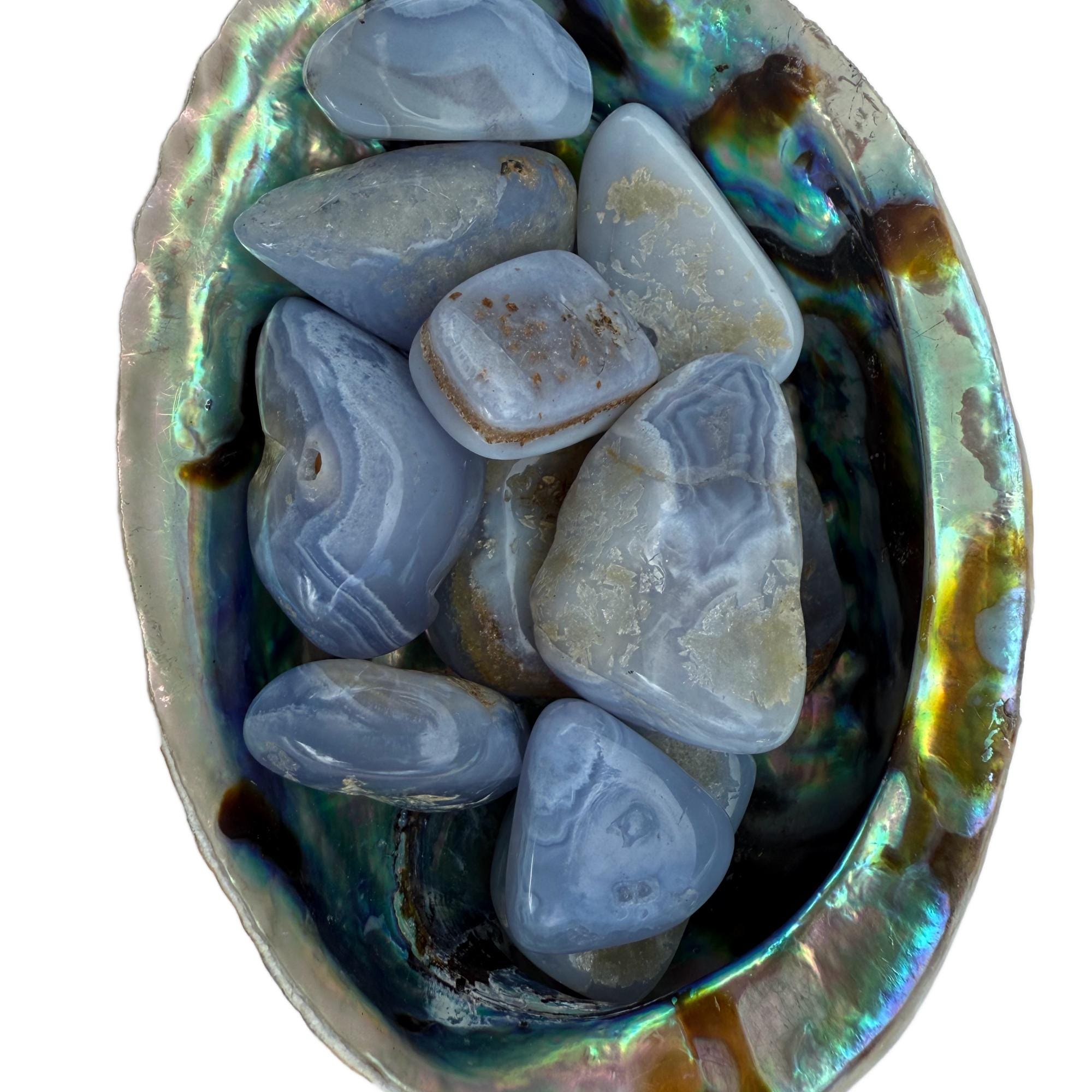 Bring serenity into your life with the gentle, peaceful vibrations of Blue Lace Agate. These polished tumble stones are known as the Stone of Peace, helping calm the mind, ease stress, and encourage loving communication. ✨ Healing Benefits: Supports relaxation and stress relief Promotes clear expression and communication Balances emotions and soothes anxiety Great for meditation, Reiki, or carrying daily 🌿 Product Details: 100% natural Blue Lace Agate Smooth, polished tumble stones Size approx. 1–1.5 inches (each stone is unique) Intuitively chosen just for you Perfect for crystal collectors, healers, or anyone seeking a gentle reminder of peace and emotional balance.