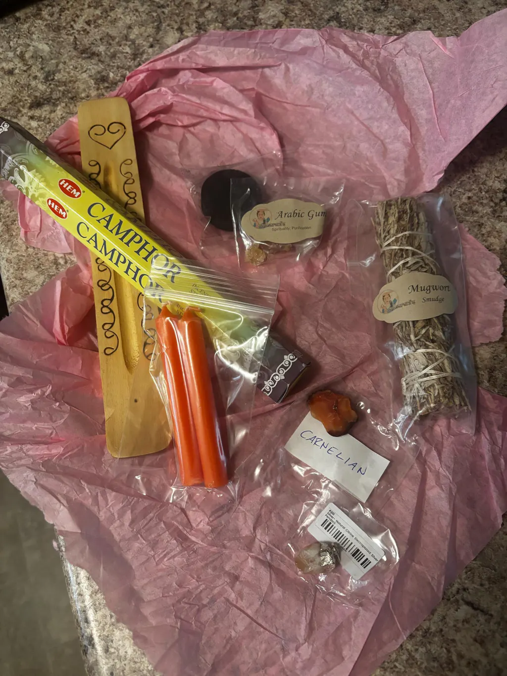 • Crystals & tumbled stones • Ritual herbs or incense blends • Jewelry or spiritual charms • Candles, altar tools, or spell supplies • Mini spell kits or sacred tokens • Other witchy surprises intuitively chosen for you